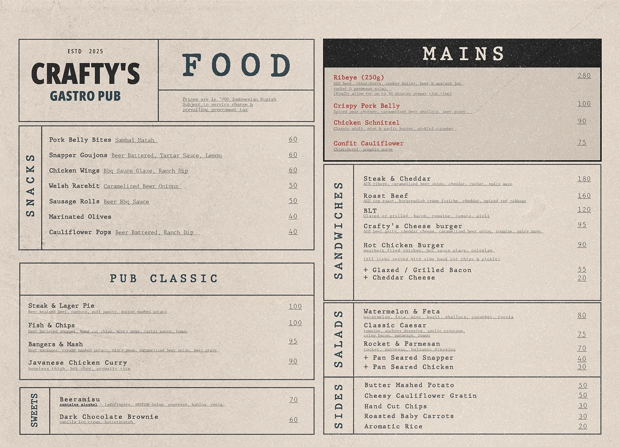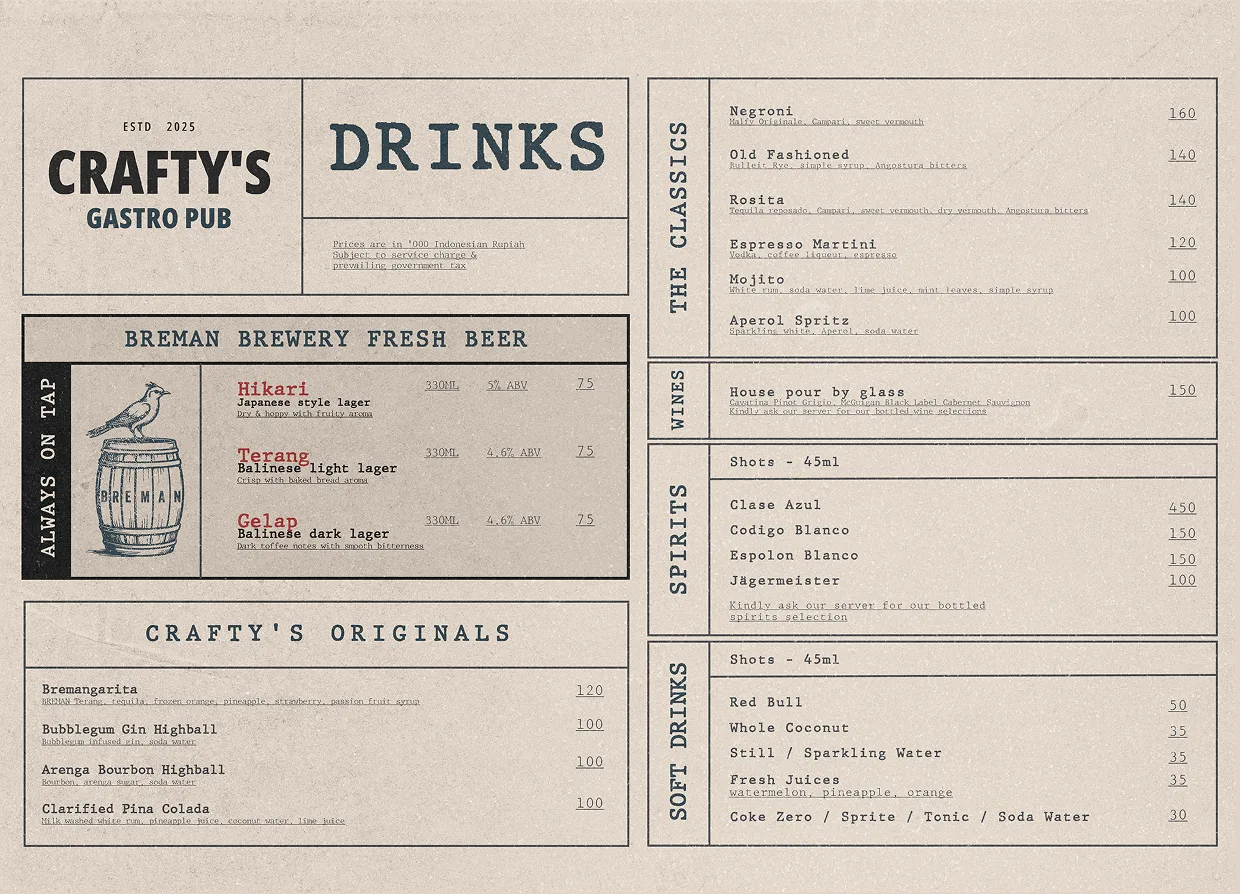 Experience the vibrant heart of Canggu at Crafty’s Gastro Pub! Conveniently located near 7AM Bakers Bali, Liga Tennis, Dharma Residences & Meat Emporium. Enjoy mouth-watering comfort food, craft beers from Breman Brewery, & a variety of wines, mocktails, & juices. Relax with live sports, music, & entertainment, connect with friends, or host events in The Loft. A top Canggu dining spot, Crafty’s offers a cosy dining experience.